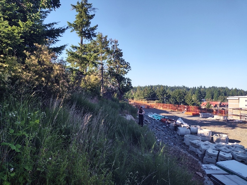 While the Power To Be case study focused on post-occupancy evaluation, our collaboration has since expanded to visiting future project sites in their early design phases. These pre-construction visits offer a different kind of opportunity, to listen to the land before lines are drawn and construction begins. At a recent site walk for the Millstream project, a residential development underway in Langford, I joined Hayley Johnson from CLA to observe how ecological stories and patterns can emerge in the site’s edge conditions, pointing to new possibilities for ecological restoration.