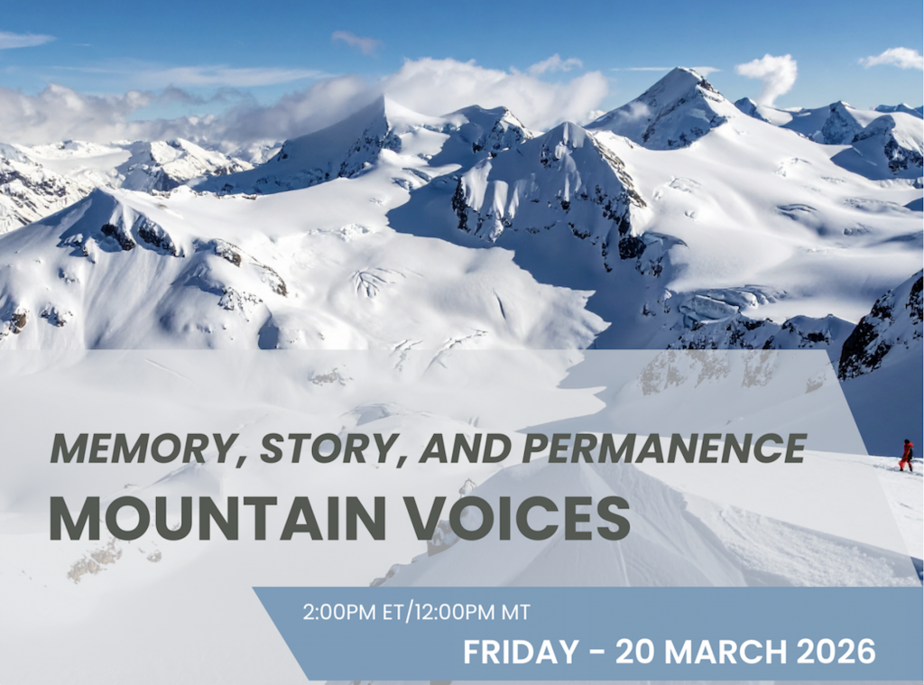 The conversation will continue on March 20 with a virtual roundtable hosted by NiCHE: Mountain Voices: Memory, Story, and Permanence. Timed with the World Day for Glaciers, the discussion will focus on the art, science, and history of capturing images and stories in mountain landscapes.
